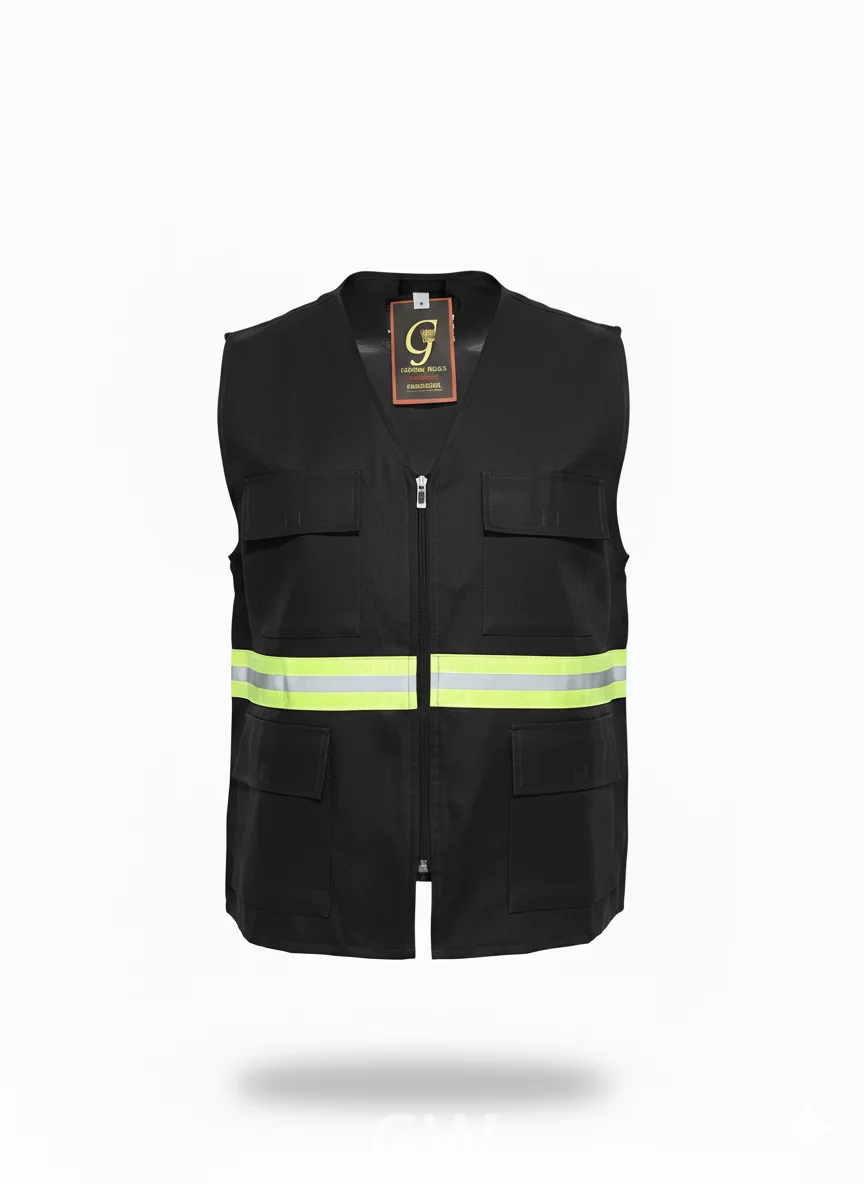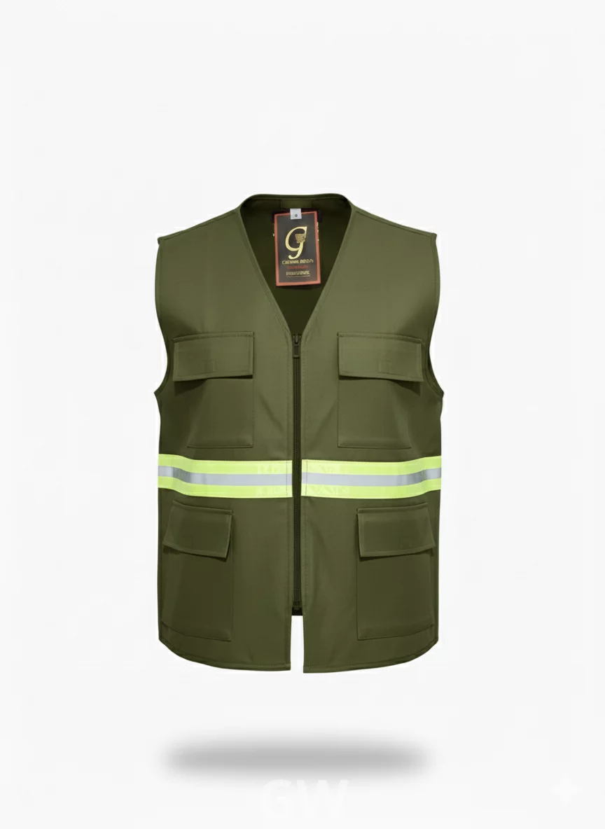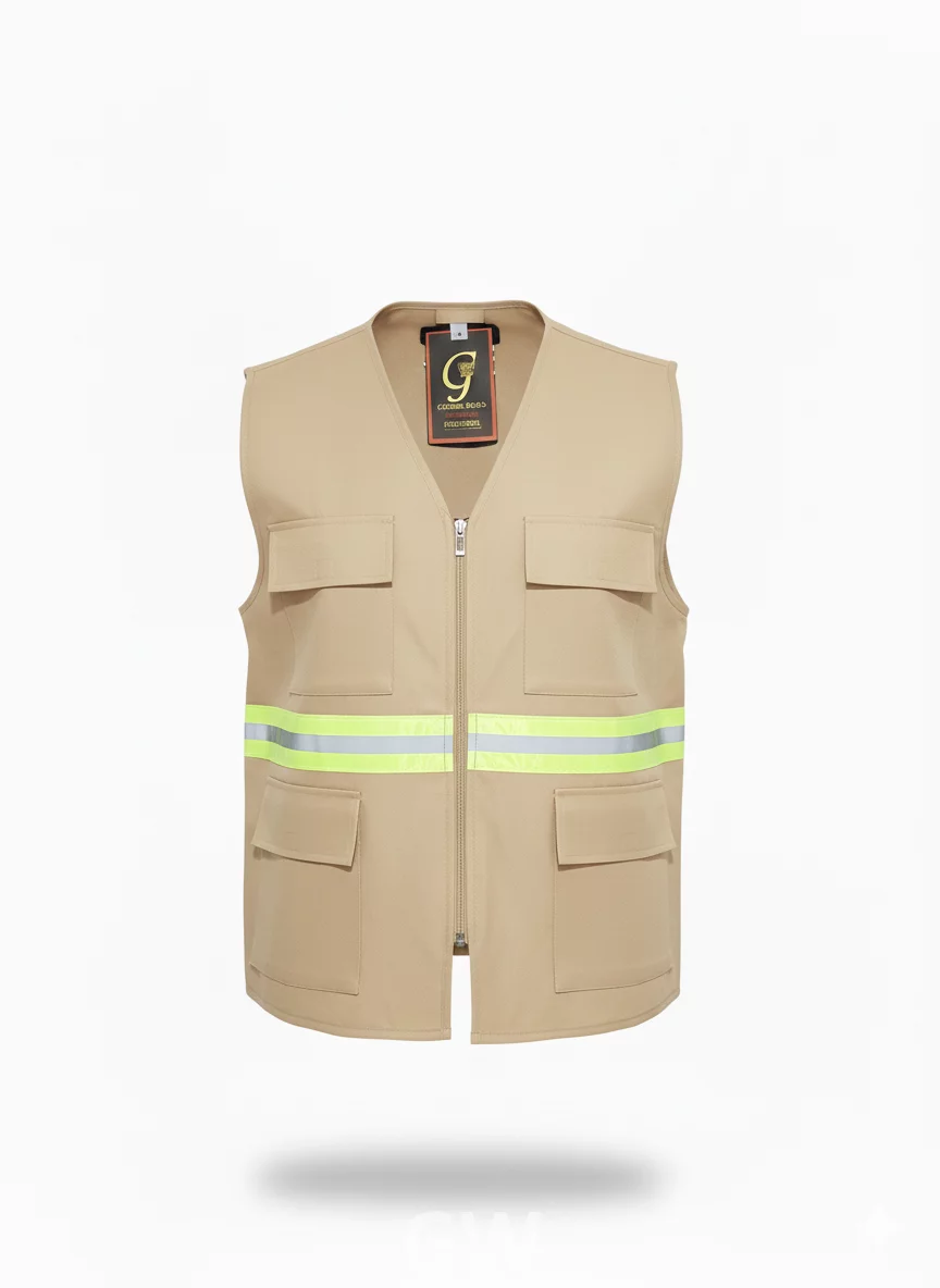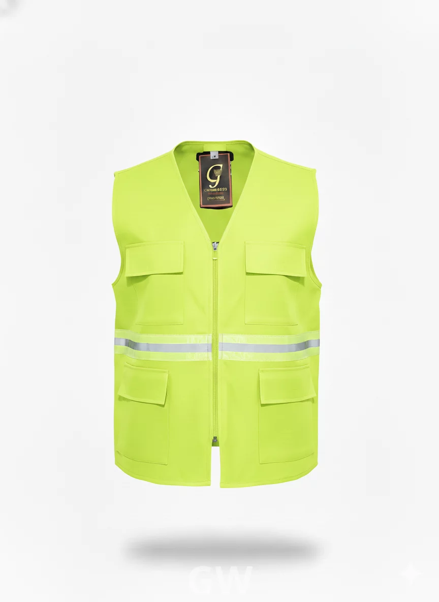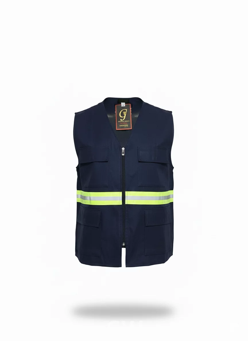 الشريط العاكس: يوجد شريط عاكس أفقي باللون الفضي مع حواف صفراء فاتحة يمر عبر منتصف الفيست، أسفل جيوب الصدر مباشرة. هذا الشريط يعزز الرؤية في ظروف الإضاءة المنخفضة، مما يجعله مثاليًا لأغراض السلامة.