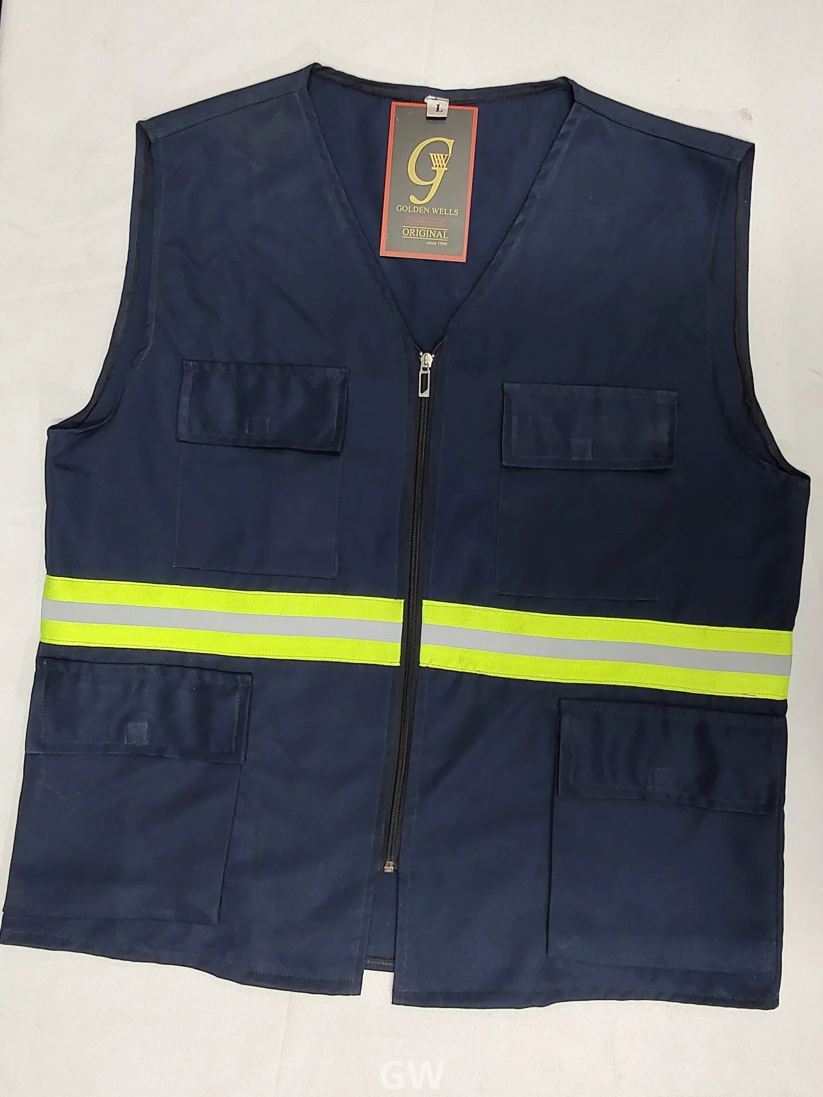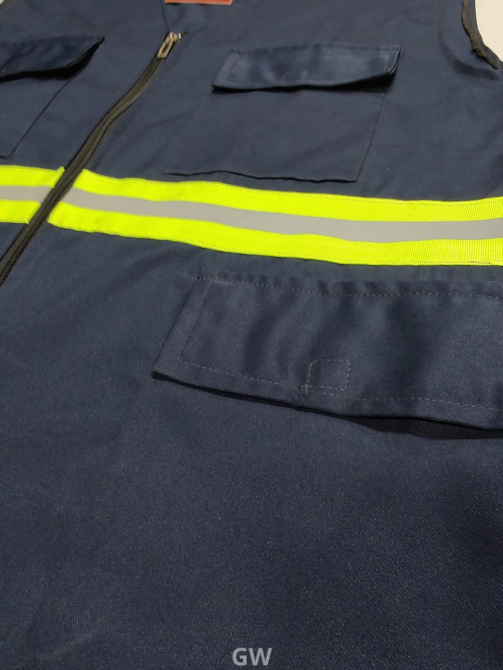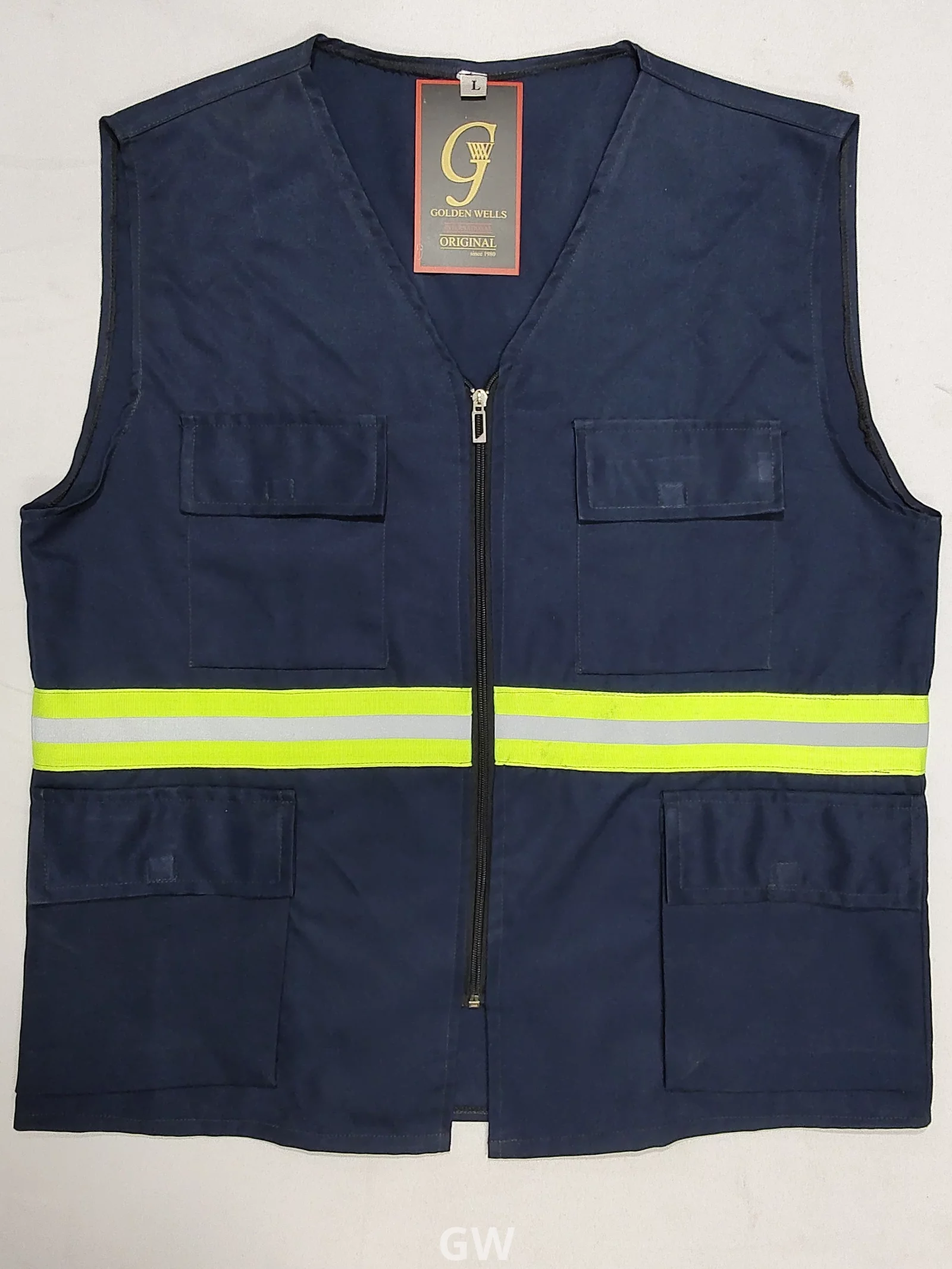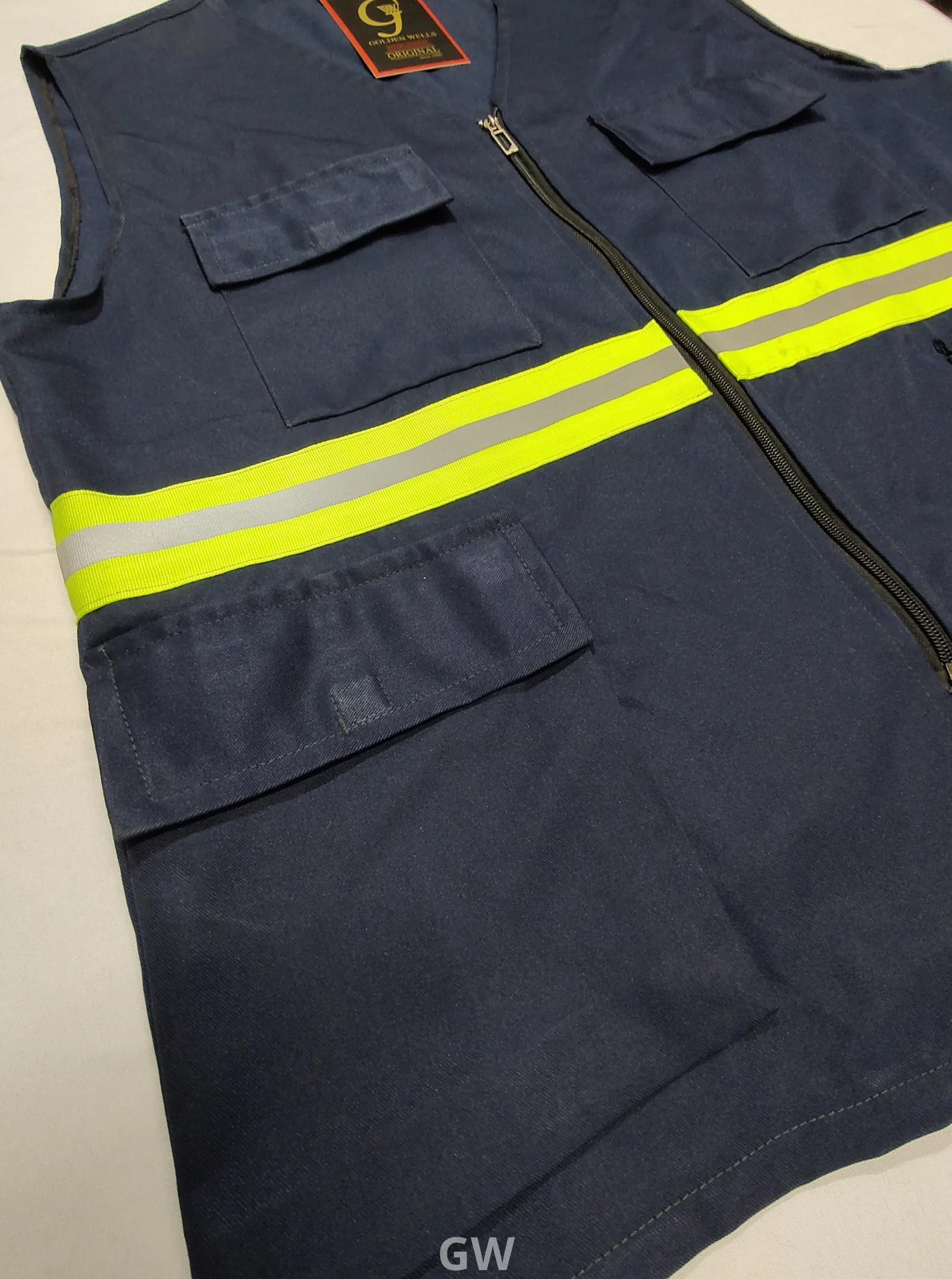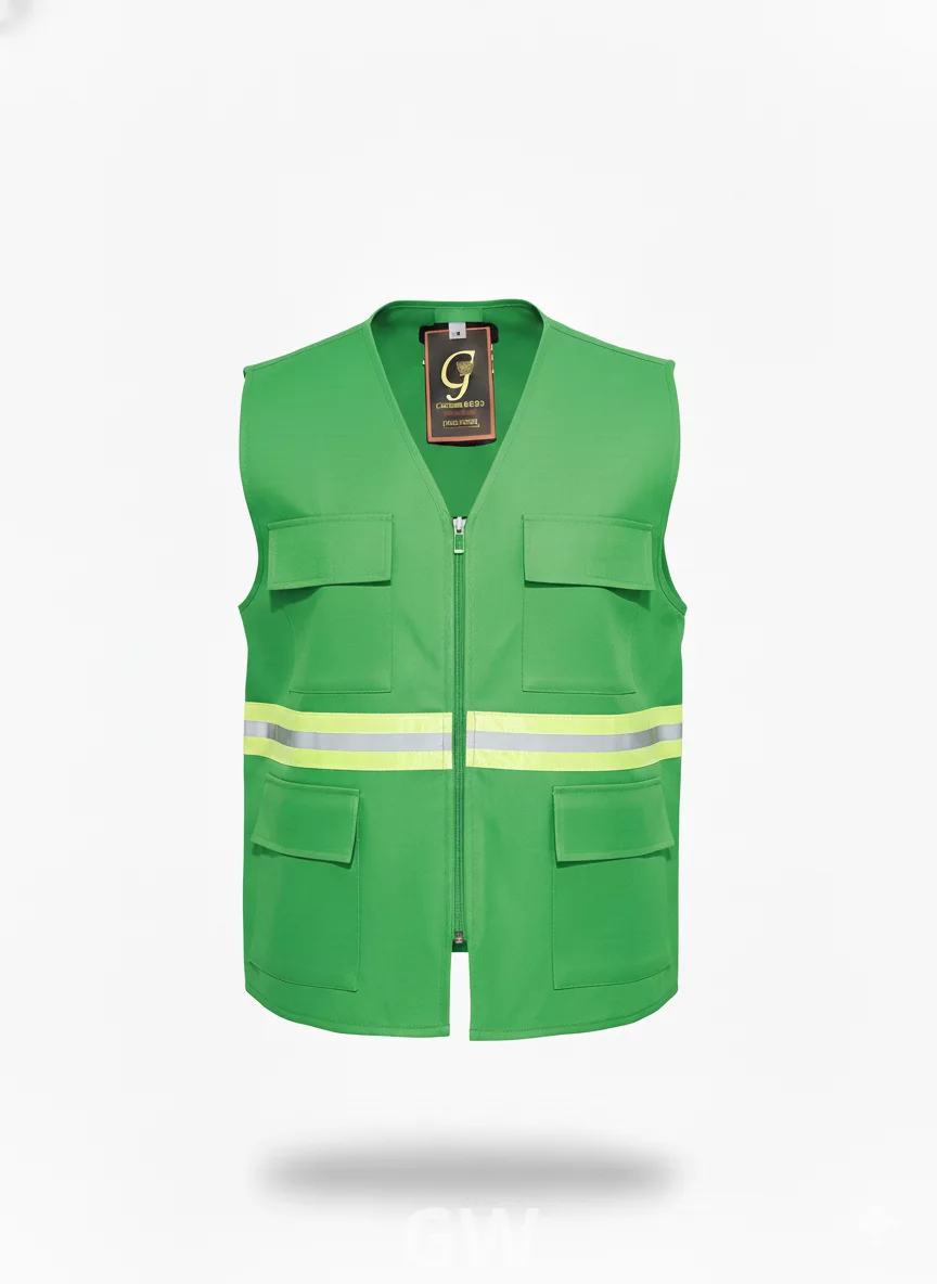 الشريط العاكس: يوجد شريط عاكس أفقي باللون الفضي مع حواف صفراء فاتحة يمر عبر منتصف الفيست، أسفل جيوب الصدر مباشرة. هذا الشريط يعزز الرؤية في ظروف الإضاءة المنخفضة، مما يجعله مثاليًا لأغراض السلامة.