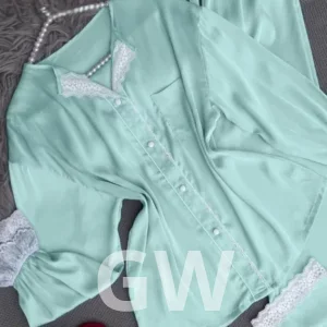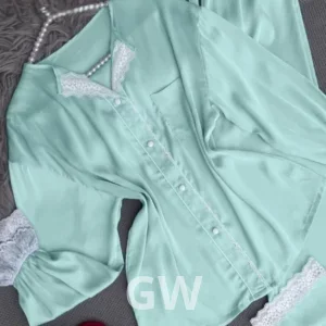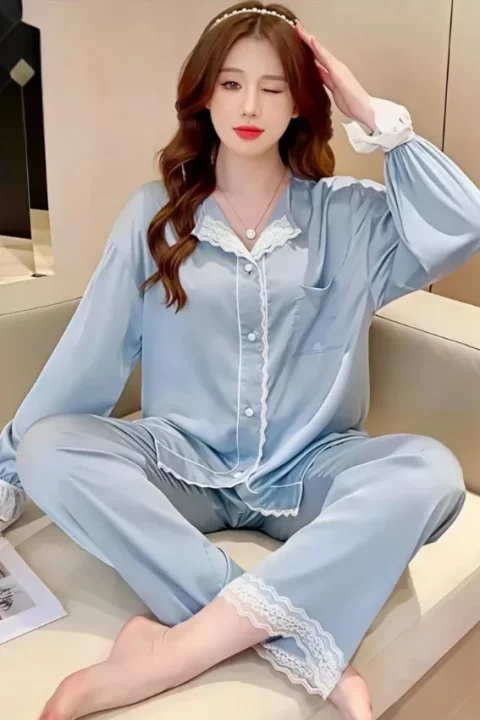طقم بيجامة أنيق من الدانتيل بأكمام طويلة