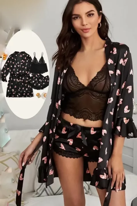 طقم بيجامة بأكمام قصيرة وطبعة قلب