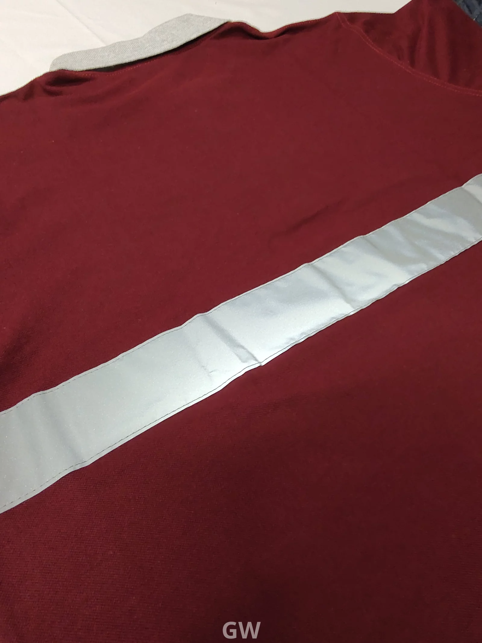 الياقة والأكمام : ياقة ”بولو“ باللون الرمادي الفاتح والاساور باللون الرمادي الفاتح.