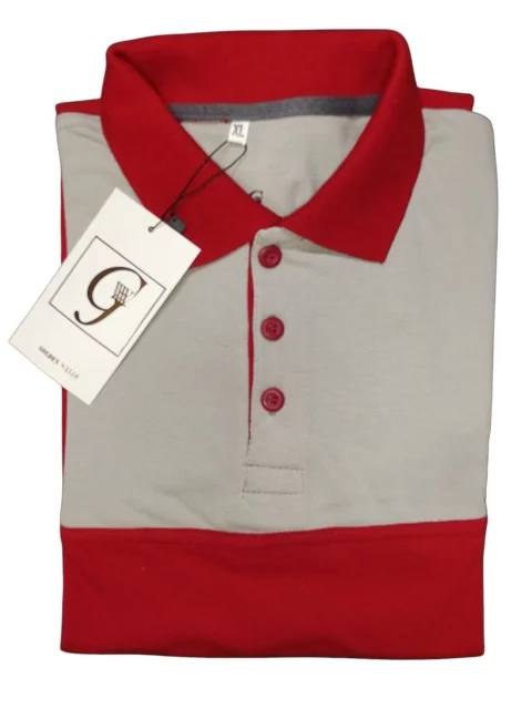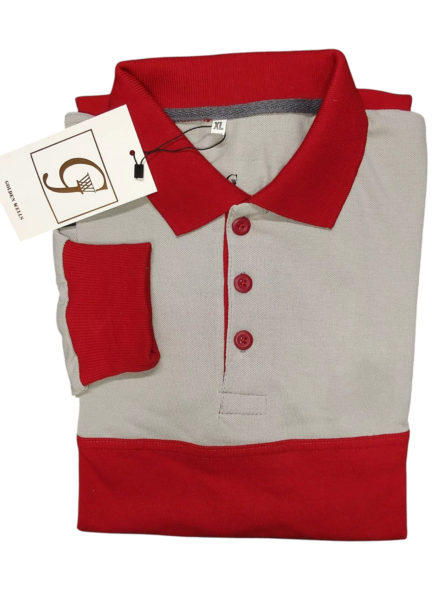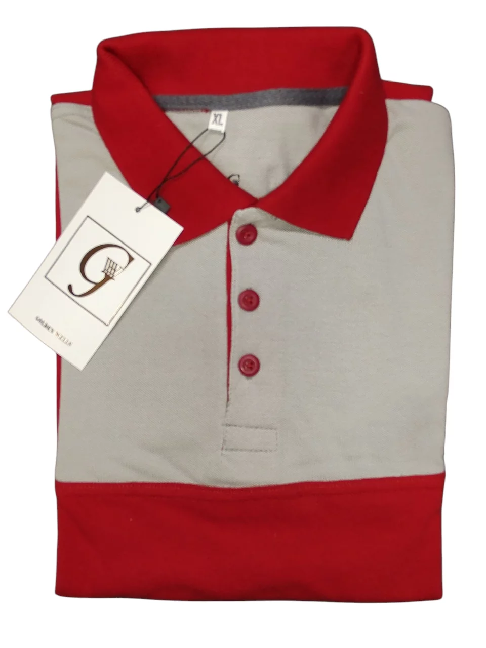 الياقة (Collar): ياقة بولو كلاسيكية باللون الرمادي الفاتح، تتماشى مع الجزء العلوي للتيشرت والأكمام.
