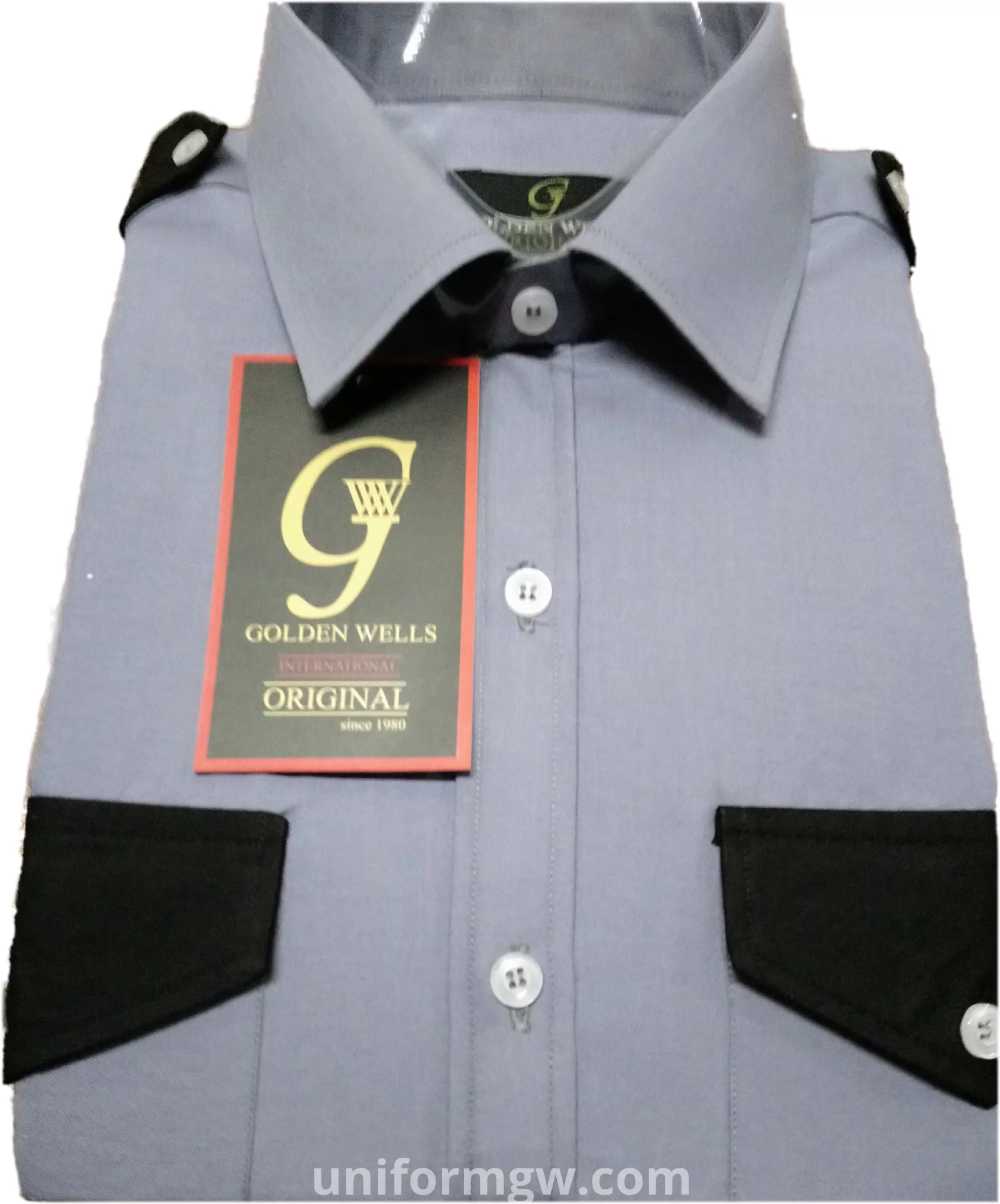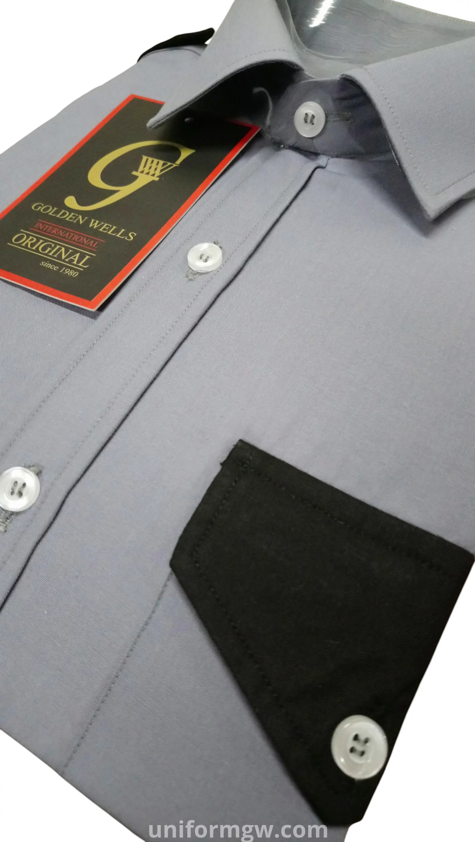 إنه قميص عمل أو زي رسمي أنيق يجمع بين واللمسات الداكنة (الأسود) على أغطية الجيوب والكتافيات، مما يمنحه مظهراً منظماً ومهنياً.