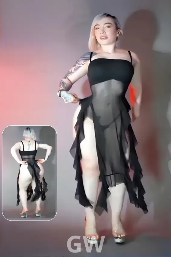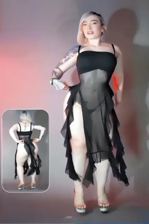 فستان شبكي شفاف مع حافة مكشكشة وتفاصيل أشرطة