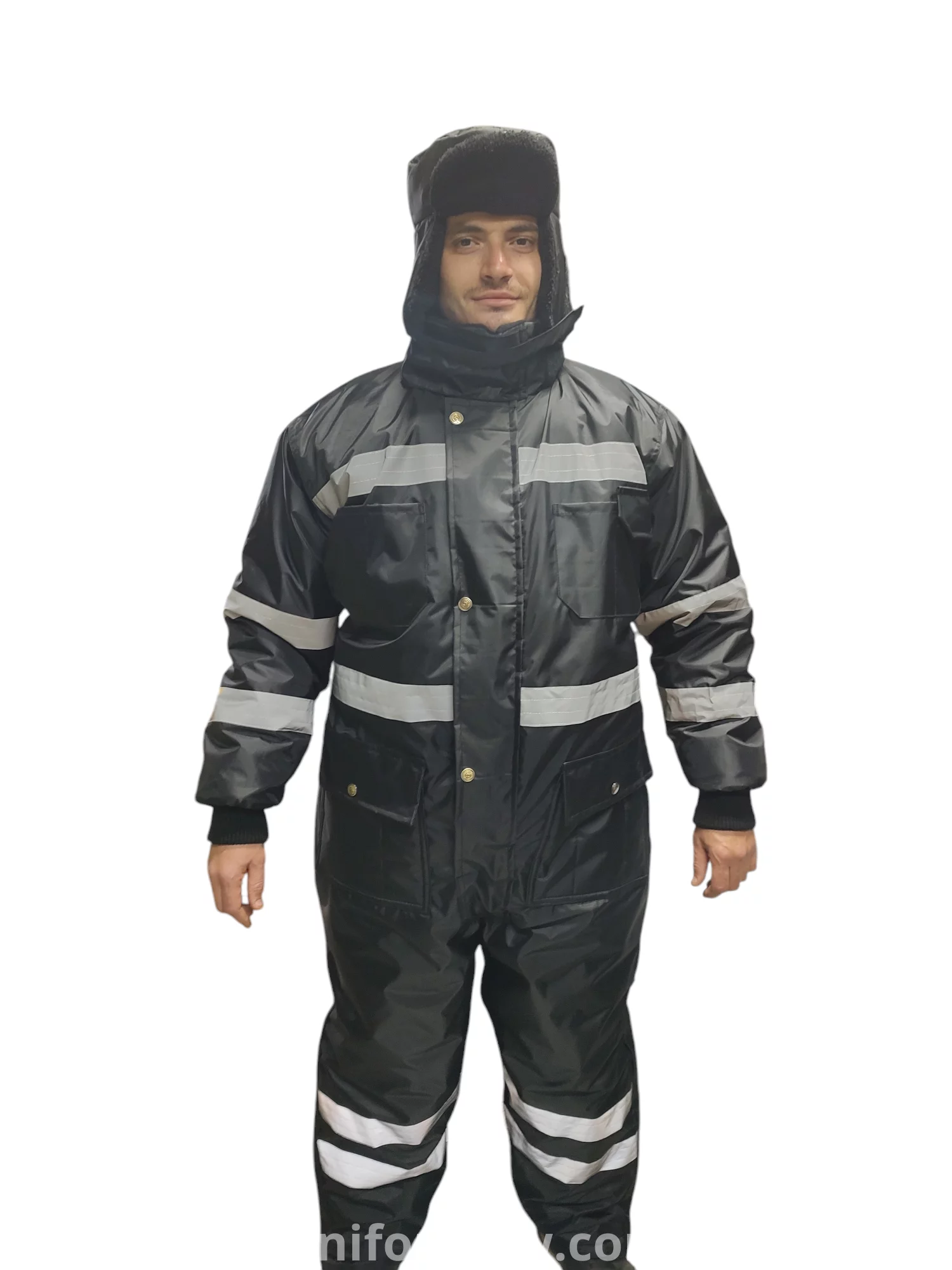 Waterproof, excellently resistant to abrasion. Quilted insulation for thermal insulation. The elastic waistband at the back allows for a very good fit. Insulating knitted cuffs. Warning tape improves visibility. Zippers at ankle height for easier fitting over shoes. Covered tension at front with Velcro. Highly waterproof, eco-friendly fabric finish, water droplets stay away from the fabric surface. Fleece collar insulation retains heat and increases comfort of use.Certified cold protection down to -50°C. spacious pockets. Kneepad pockets for easy putting on. Phone pocket. The foldable hood is an added benefit. Two-way zipper.