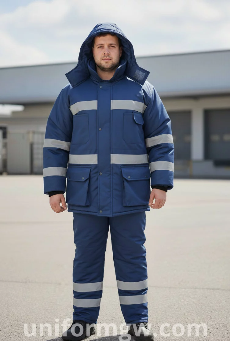 A three-piece freezer suit—comprising a freezing-resistant jacket, insulated pants, and a hood—is designed to protect workers from extreme cold conditions in coolers, cold storage warehouses, and outdoor freezing environments. These suits are essential for maintaining body warmth