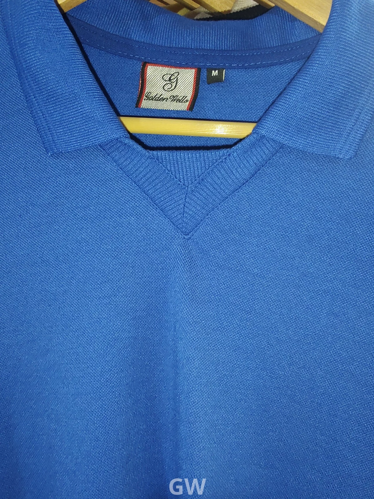 A men's long-sleeved royal blue pique polo t-shirt, featuring a classic polo collar followed by a ribbed V-neck opening, which gives it a modern and distinctive touch. The t-shirt is made from high-quality pique fabric that provides good ventilation and a comfortable feel. The long sleeves end with ribbed cuffs to ensure a secure and comfortable fit. The t-shirt is displayed on a wooden hanger, and a small red and white tag with the brand's logo is visible on it. The design is casual and practical, suitable for everyday wear.