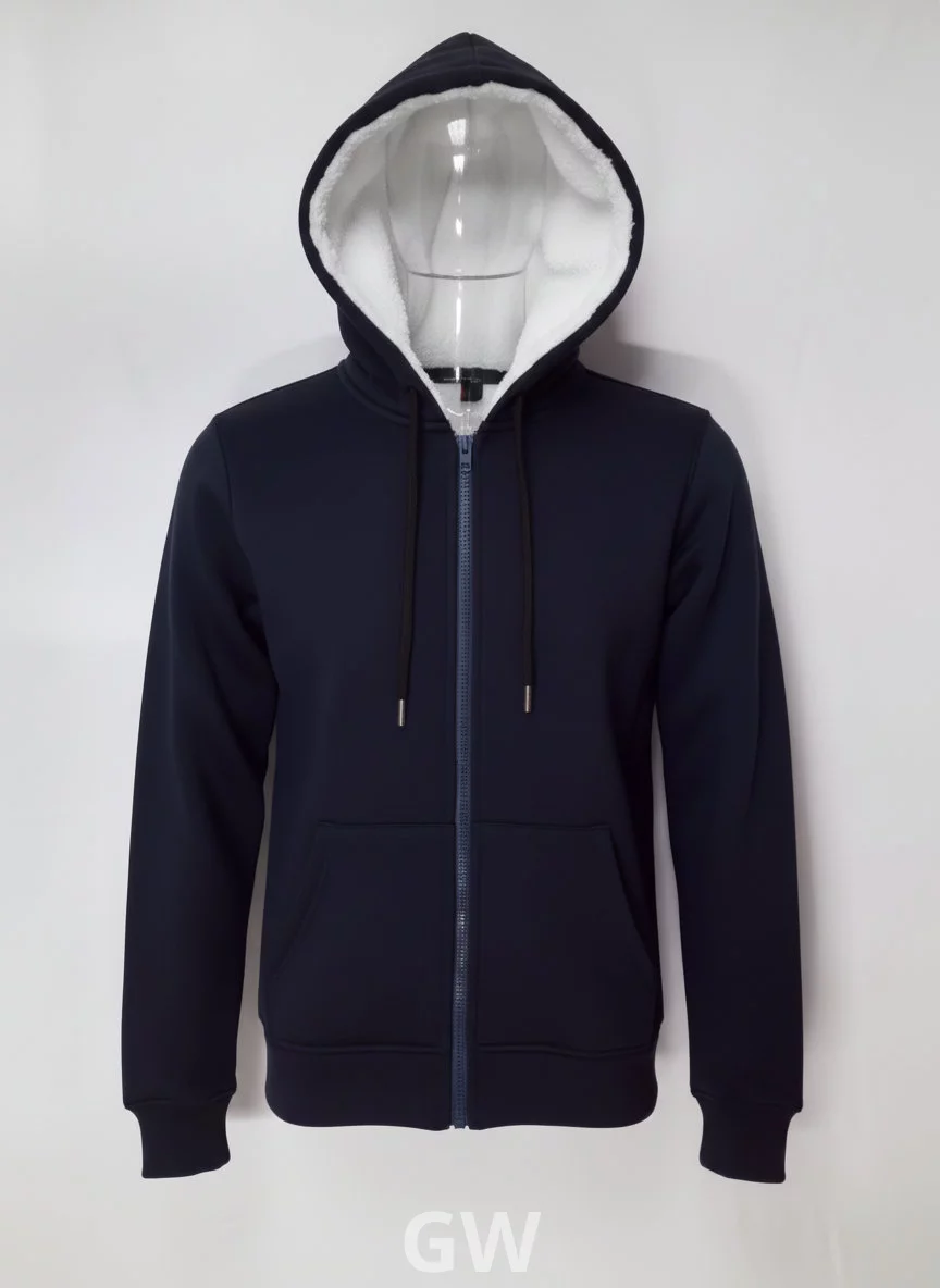 The outer material of the Sweatshirt is made of soft Melton or fleece fabric, while the inner fleece lining provides a super soft and warm feel. The hoodie includes a hood lined with the same white fleece, equipped with two adjustable black drawstrings. It comes with a full front navy zipper, making it easy to put on and take off and allowing for adjustable warmth. It features two front "kangaroo" style pockets, practical for warming hands or storing small items. The long sleeves and bottom hem of the hoodie end with ribbed cuffs to provide a snug fit and trap warmth. The design is casual and practical, suitable for everyday wear.