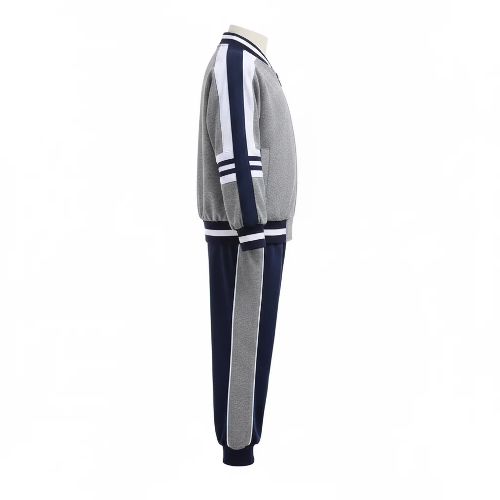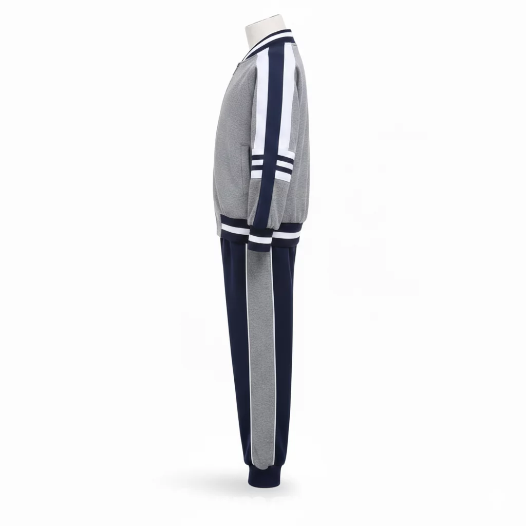 This full Melton fleece sports sweatshirt, Zipper closures and a grey color with dark blue and white stripes, is a practical and comfortable clothing item that perfectly suits the needs of students across various educational stages.