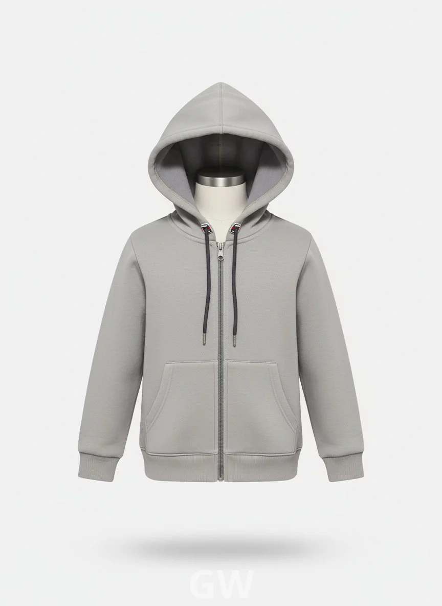full-zip Melton hoodie in light grey, designed for children. It features a classic and comfortable design that provides warmth and style for colder days. The hoodie is made from soft and warm Melton fabric, making it a comfortable staple for children's everyday wear or even as part of a casual school uniform.
