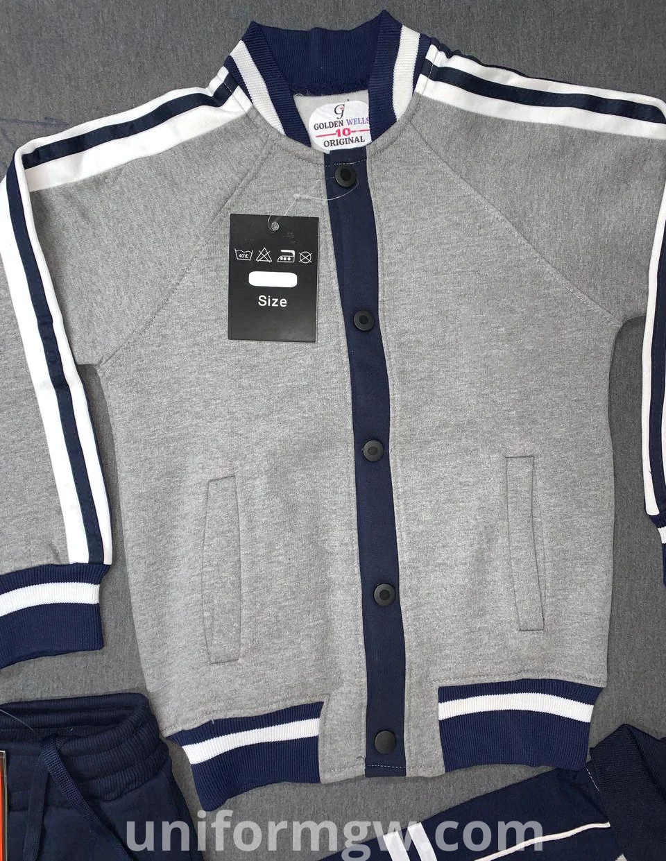 This full Melton fleece sports sweatshirt, featuring snap closures and a grey color with dark blue and white stripes, is a practical and comfortable clothing item that perfectly suits the needs of students across various educational stages.