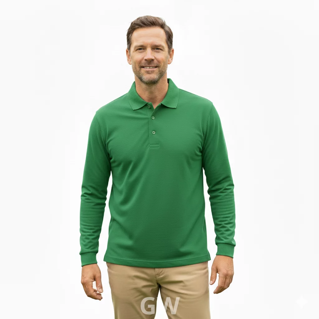 An elegant and comfortable long-sleeved polo t-shirt in an attractive royal green color. It features a classic ribbed collar and matching front buttons, adding a touch of sophistication. Made from high-quality pique fabric that provides warmth and comfort with ideal breathability, making it perfect for wear on cooler days or for a smart and contemporary look.
