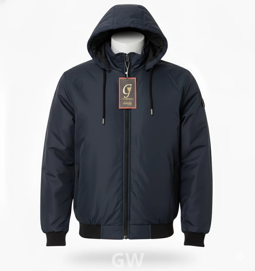 dark navy waterproof padded jacket, featuring a classic and simple design that provides warmth and protection from the elements. The jacket is made from wind and water-resistant fabric, and is internally padded to offer effective thermal insulation. It comes with a high stand-up collar to protect the neck from the cold, and a full front black zipper.