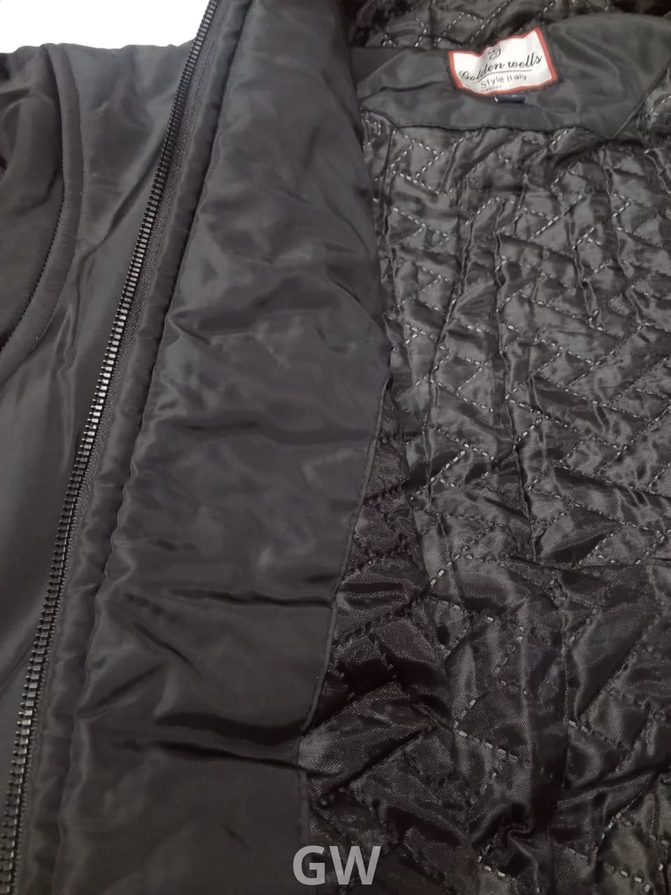 The jacket includes two side pockets with hidden black zippers, practical for securely storing small items. The sleeves end with dark navy ribbed cuffs, as does the bottom hem of the jacket, ensuring a snug fit and preventing cold air from seeping in. A small logo is visible on the left sleeve. . The design is practical and comfortable, suitable for everyday wear in autumn and winte